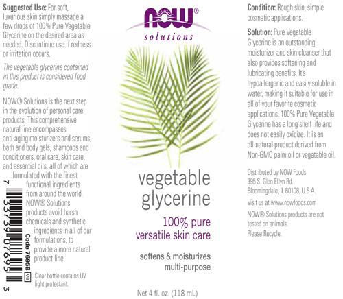 NOW® Solutions is the next step in the evolution of personal care products. This comprehensive natural line encompasses anti-aging moisturizers and serums, bath and body gels, shampoos and conditioners, oral care, skin care, and essential oils, all of which are formulated with the finest functional ingredients from around the world. NOW® Solutions products avoid harsh chemicals and synthetic ingredients in all of our formulations, to provide a more natural product line.Condition: Rough skin, simple cosmetic applications. Solution: Pure Vegetable Glycerine is an outstanding moisturizer and skin cleanser that also provides softening and lubricating benefits. It’s hypoallergenic and easily soluble in water, making it suitable for use in all of your favorite cosmetic applications. 100% Pure Vegetable Glycerine has a long shelf life and does not easily oxidize. It is an all-natural product derived from Non-GMO palm oil or vegetable oil.