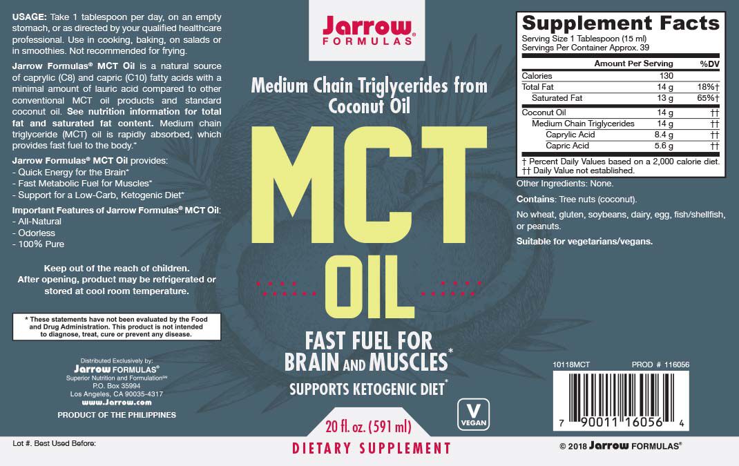 Jarrow Formulas® MCT Oil is a natural source of caprylic (C8) and capric (C10) fatty acids with a minimal amount of lauric acid compared to other conventional MCT oil products and standard coconut oil. Medium chain triglyceride (MCT) oil is rapidly absorbed, which provides fast fuel to the body.
