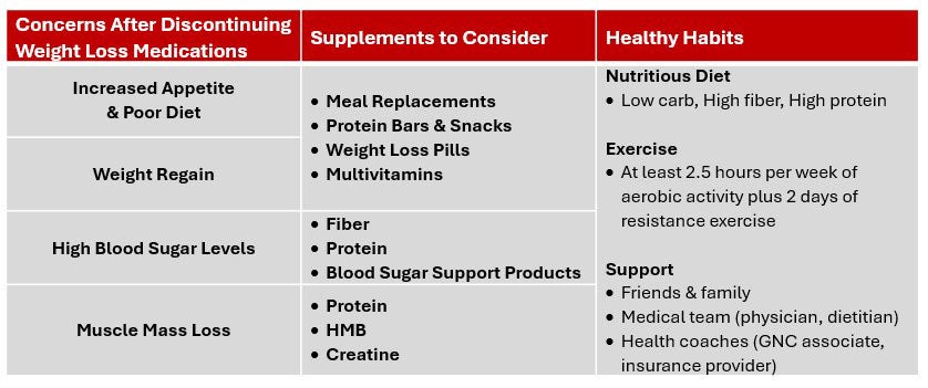- There are also supplements you can consider after coming off of a weight loss medication, such as multivitamins, protein, meal replacements, and more depending on your goal.