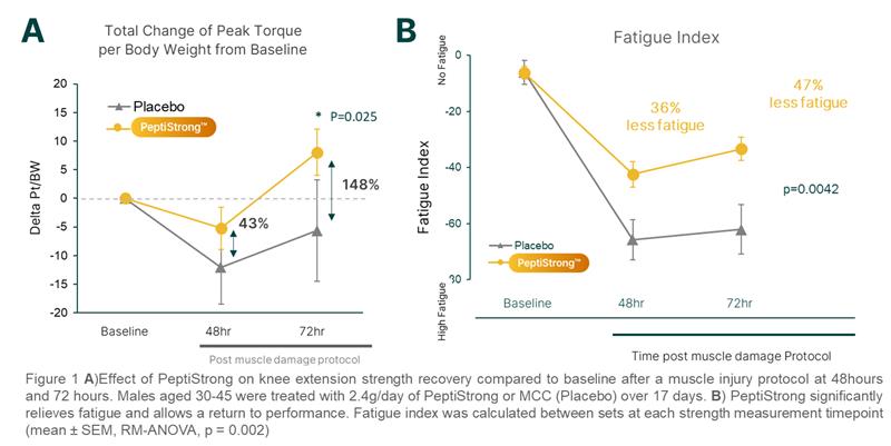 One such trial was conducted in 30 men and investigated how PeptiStrong™ could improve strength recovery and reduce fatigue. After establishing their baseline strength, the participants began supplementing with 2.4 grams of PeptiStrong™ or a placebo for 14 days. During this clinic visit, delayed onset muscle soreness (DOMS) was induced in the subjects using resistance exercise muscle damage protocol. The strength recovery and fatigue of the subjects was measured (including blood samples) over the course of the following 3 days. As shown in Figure 1A and 1B, PeptiStrong™ was shown to significantly improve strength recovery, restoration, reduce fatigue, and positively modulated markers related to muscle homeostasis [7].