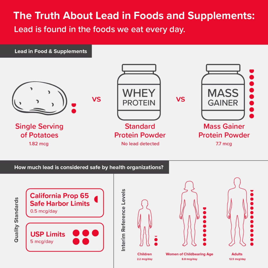To help compare apples to apples, below is a chart that outlines the limits for heavy metals as established by health organizations, the amounts found in a serving of common foods, and the amounts found in protein powders. If you’re wondering, “How much lead is in my protein powder?” Here’s one way to understand it: You would need to drink eight servings of our GNC Pro Performance 100% Whey protein to match the amount of naturally occurring lead found in a single serving (85g) of lettuce.