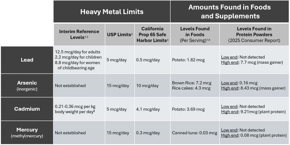 - Consumer Reports recently published test results evaluating the lead and heavy metal content of protein powders and shakes. However, the limits were based on a very low and restrictive amount of heavy metals established by the state of California.