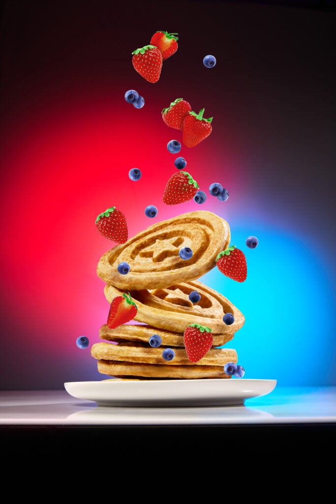 Breakfast has never tasted so good. Get ready to whip up something truly super in the kitchen – a breakfast so delicious and protein-packed, it’s worthy of the First Avenger himself, Captain America. Yes, that’s right – we’re making a twist on the classic pancake featuring a Captain America-themed protein powder. GNC has teamed up with Marvel to launch a Captain America-themed protein flavor, GNC Pro Performance 100% Whey Star Spangled Birthday Cake. Talk about fun and delicious!