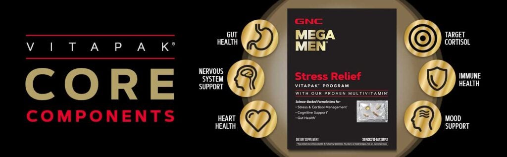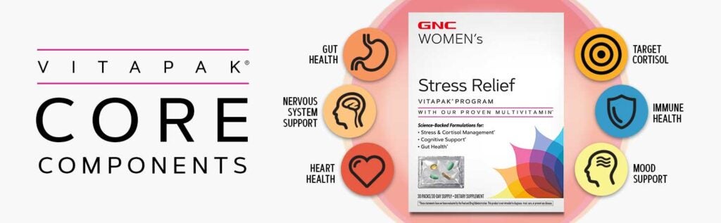 What’s great about GNC’s Stress Relief Vitapak is how it stacks up to leading stress aid supplements. If you look for other supplements for helping with stress, you’ll find they don’t quite stack up to our formula. We feature a clinically studied ashwagandha to help reduce cortisol and a clinically studied multi blend. It’s our most comprehensive routine targeting cortisol and providing mood support, gut health, and overall wellness support. These benefits were at the forefront of our scientist minds when developing this Vitapak program. Some of the added benefits beyond stress support you might not find in other stress aid products include: